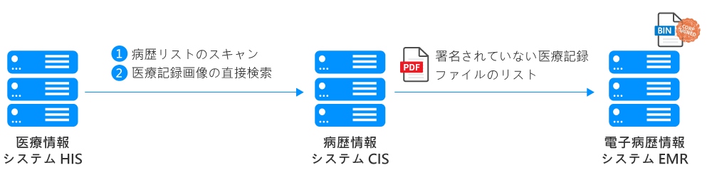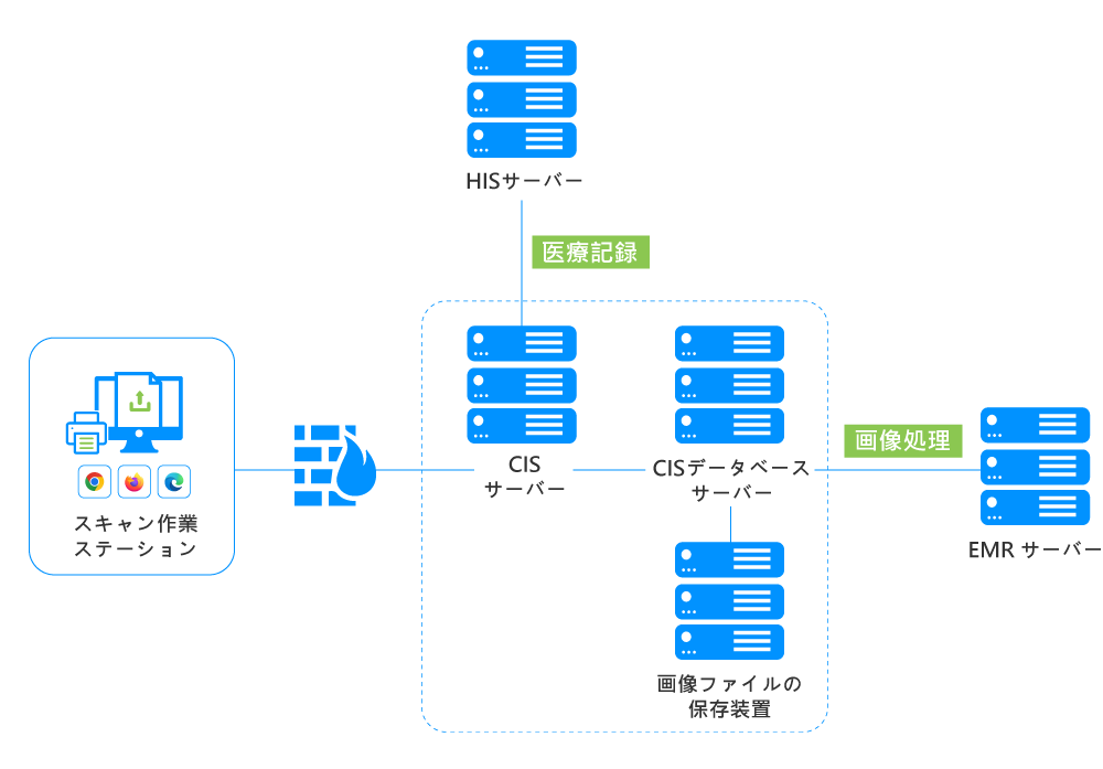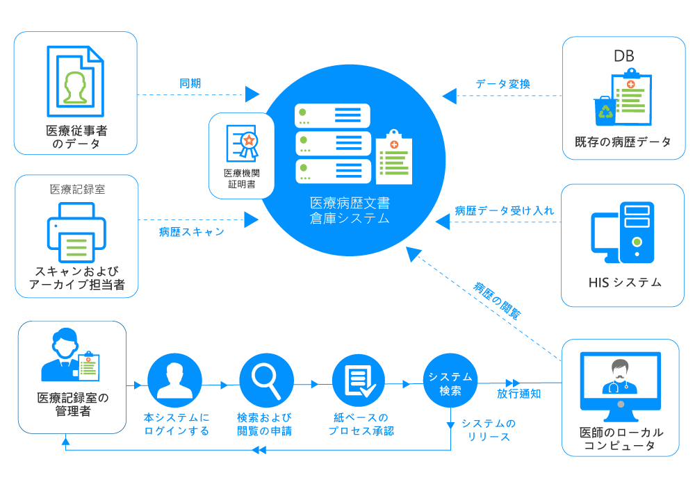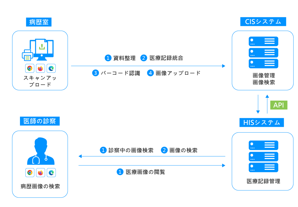 患者の来院情報および医療記録画像は、病院情報システム(HIS)と統合され、アクセス可能です。また、電子医療記録法に準拠したファイル形式に変換され、電子医療記録システム(EMR)との統合およびアクセスが可能です。