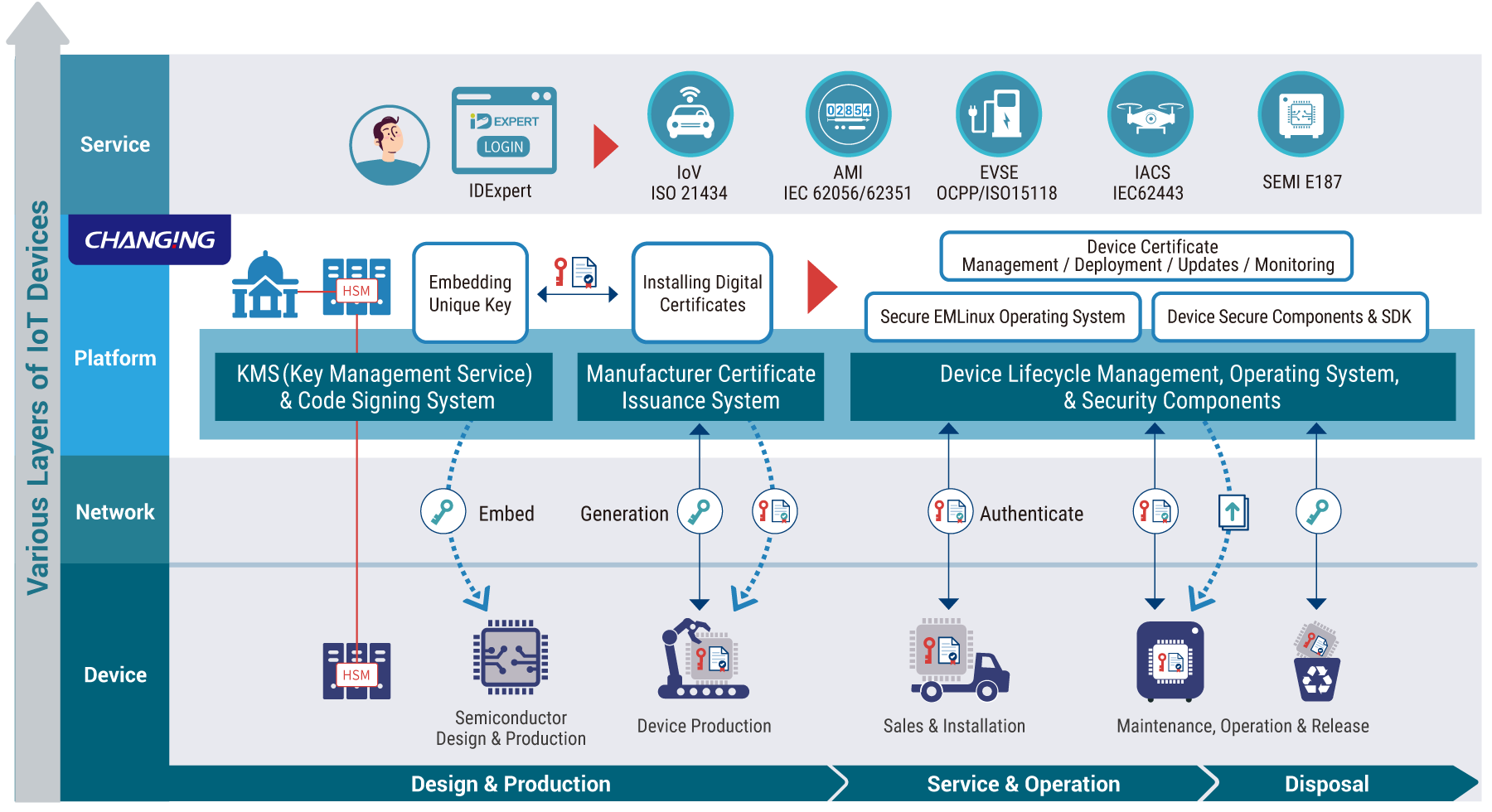 スマートメーターや都市センサーに証明書管理、RoT設計、署名検証、鍵の更新・失効機能を導入。IEC 62443や61850などの国際基準に対応し、安定稼働を実現します。