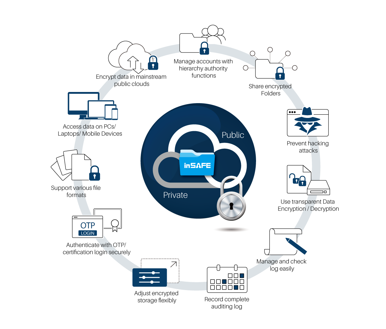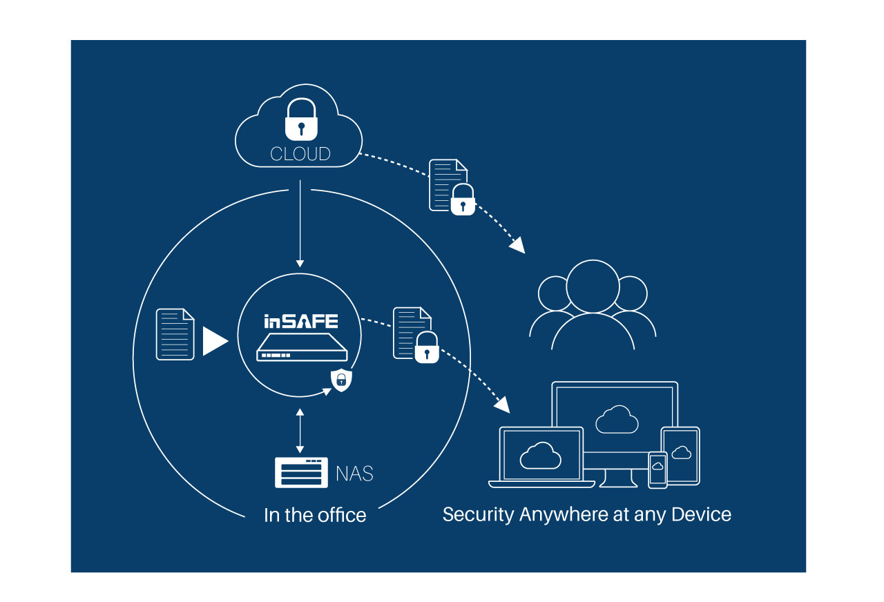 inSAFE混合雲檔案安全系統,是一套專為混合雲端儲存與備援需求而設計的安全解決方案,透過inSAFE安全伺服器可協助企業更放心更便利的使用檔案混合雲系統。