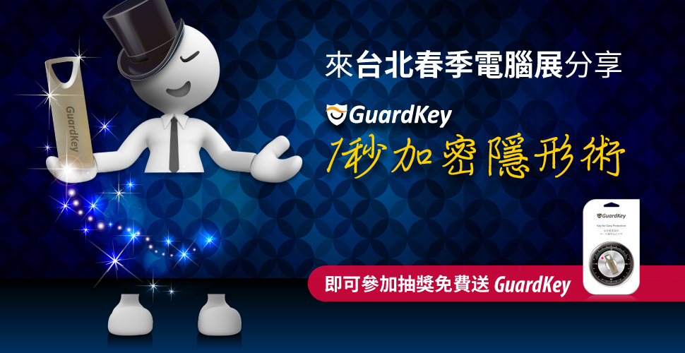 而最受3C玩家青睞的 GuardKey,也將在此次活動中成為焦點!GuardKey就像一把鑰匙,透過建置「檔案保險箱」的方式來加密您的機敏資料,當GuardKey自電腦端移除,加密資料即隱形,讓您加密不留痕跡!將GuardKey接上電腦,檔案即自動解鎖。同時它也支援雲端硬碟,搭配GuardKey Viewer APP的「行動解鎖」、「行動閱覽」、影音照片「即拍即鎖」等功能,是雲端世代最貼心、CP值最高的加密工具!