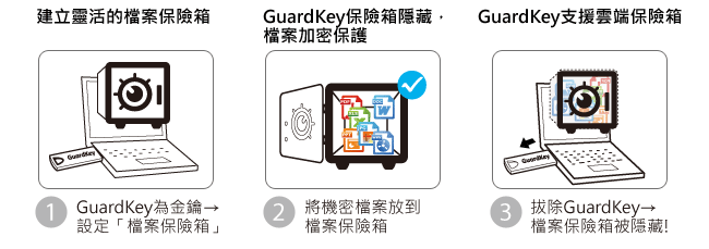無論是桌機、筆電、雲端硬碟、外接式硬碟或記憶卡,利用GuardKey來建立加密的資料夾-即「檔案保險箱」,將您需要加密的檔案存到檔案保險箱內,這些檔案即完成加密手續,也毋須額外記憶加/解密的密碼,而當GuardKey自電腦端移除時,加密的資料夾即隱形,更可免除許多不必要的困擾!