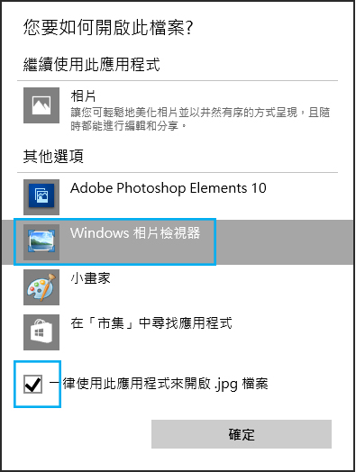 3) 勾選[一律使用此應用程式開啟檔案]並選擇[Windows相片檢視器]