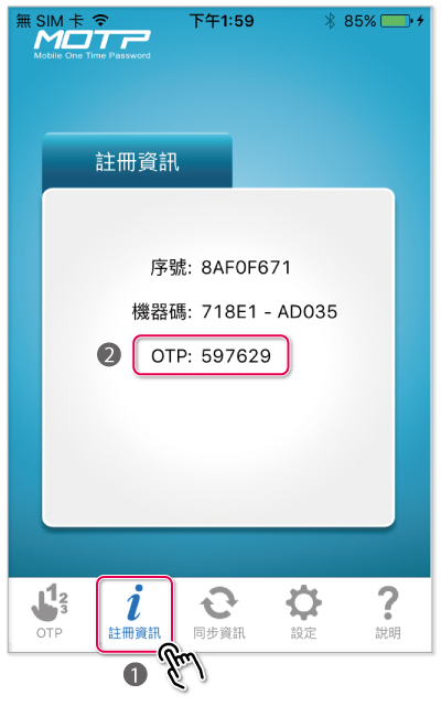 2. 將「註冊資訊」畫面中顯示的OTP輸入欲登入的系統中。