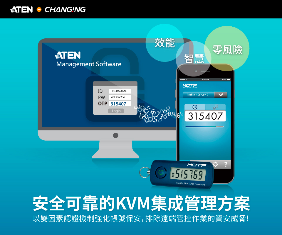 全景軟體與全球資訊設備連接管理方案領導廠商-宏正自動科技(ATEN International,以下簡稱ATEN)攜手合作,帶來業界首創MOTP(Mobile One Time Password)行動動態密碼系統與ATEN CC2000遠端集中管理軟體的跨界整合方案,提供使用者全方位的機房資訊安全防護系統。