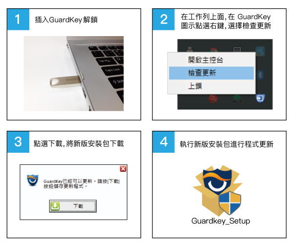 請使用者利用GuardKey線上更新機制,升級『GuardKey智慧加密碟』軟體至5.6.18.0503以上版本,日後也請保持為最新版本。