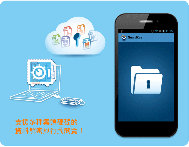 GuardKey Viewer所帶來的便利還不只這些,例如雲端硬碟上所設置的加密檔案、資料夾,就可以透過GuardKey Viewer隨時隨地開啟、瀏覽!GuardKey Viewer可支援Android手機、平板電腦、iOS裝置(iPhone、iPad)以及Windows Phone多種系統,不僅兼顧隱私與安全性,還能走到哪用到哪、方便零時差!