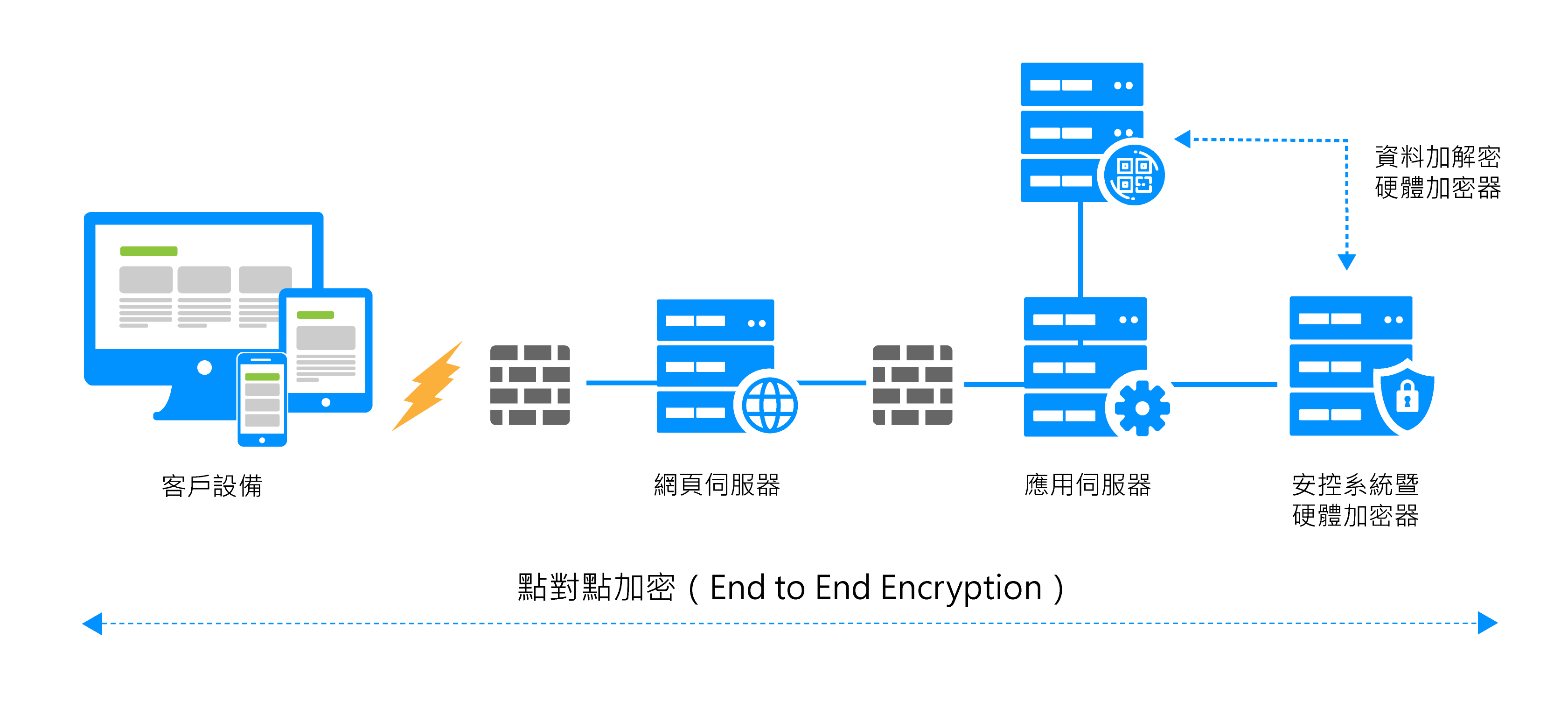 提供點對點加密(End-To-End Encryption)、資料加密(Encryption)、資料代碼化(Tokenization)等系統功能,解密金鑰(Data Decryption Key)、主金鑰(Master Key)均儲存於符合規法的硬體加密器(HSM, Hardware Security Module)